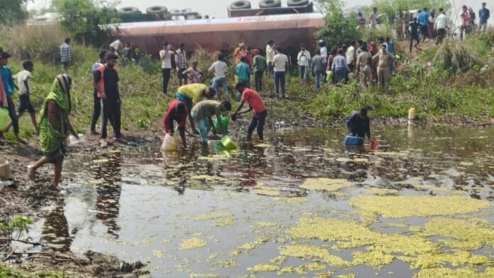 हाईवे पर पलटा सरसों के तेल से भरा टैंकर, बाल्टी – डिब्बा लेकर दौड़े लोग