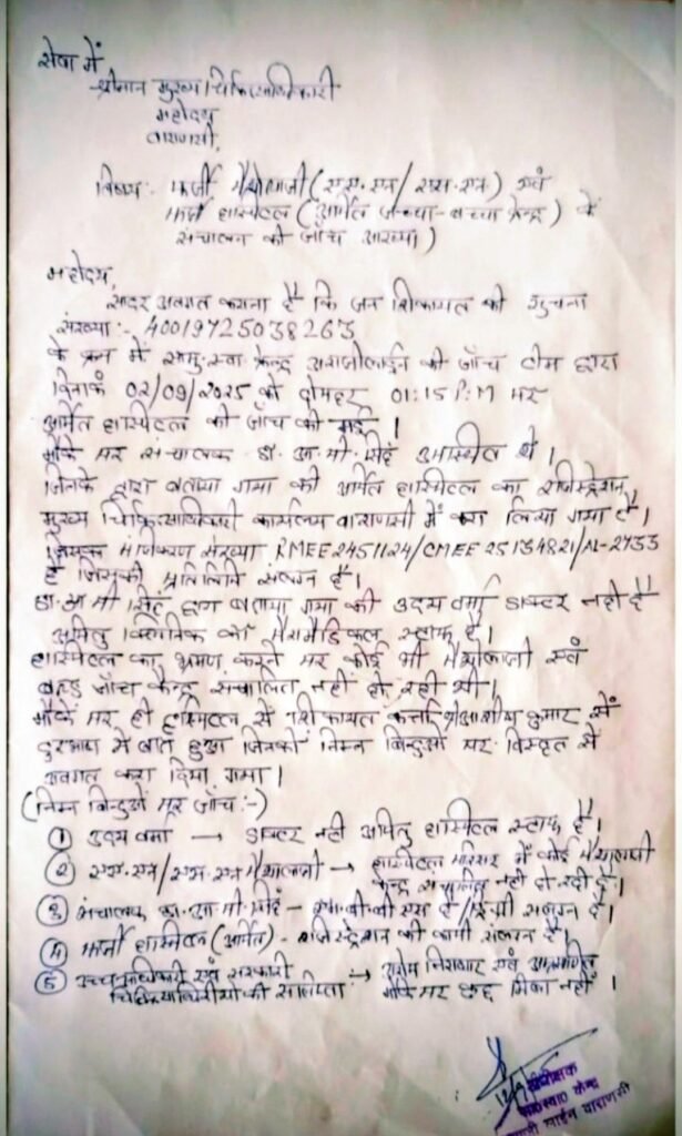 वाराणसी/-सामुदायिक स्वास्थ्य केन्द्र आराजी लाइन के अधीक्षक नवीन सिंह की रिपोर्ट सही या ऑपरेशन करने वाला डॉक्टर सही दोनों ने उलझाया।सीएचसी अधीक्षक ने ऑपरेशन करने वाले डॉक्टर को अपने जाँच में बताया है पैरामेडिकल स्टॉप उसके बाद भी ऑपरेशन थियेटर में मरीज का ऑपरेशन करते दिख रहे उदय वर्मा।सीएमओ वाराणसी संदीप चौधरी का ध्यान आकृष्ट कराते हुए समाचार पत्र के माध्यम से उपरोक्त सीएचसी अधीक्षक द्वारा लगाए गए रिपोर्ट व ऑपरेशन कर रहे उदय वर्मा के वायरल फोटो व कमरे का स्थलीय निरीक्षण कर गलत कार्य कर रहे या किये हुए कर्मचारी/अधिकारी के खिलाफ कार्यवाही कर समाज मे सरकार के जीरो टॉलरेंस का जीता जागता उदाहरण देने का कार्य करना अत्यंत आवश्यक है।आपको बता दे कि जंसा थाना क्षेत्र के जलालपुर स्थित अर्पित हॉस्पिटल एवं जच्चा बच्चा केंद्र पर तैनात अर्पित क्लिनिक का पैरामेडिकल स्टॉप बीते दिनों हॉस्पिटल में खुलेआम ऑपरेशन करते नजर आ रहे है,बीते दिनों सामुदायिक स्वास्थ्य केन्द्र आराजी लाइन वाराणसी के जाँच पड़ताल में हुआ है खुलासा लगाया गया है पैरामेडिकल स्टॉप की रिपोर्ट।सूत्रों से मिली जानकारी के अनुसार ओटी में जिस डॉक्टर के द्वारा ऑपरेशन करते हुए की फोटो बुधवार को पूरे दिन सोशल मीडिया इंटरनेट प्लेटफार्म पर वायरल हुआ था असल मे वह कोई और नही डॉक्टर उदय वर्मा जी है जो पूर्व में राजातालाब के निजी अस्पताल के डॉक्टर लालजी पटेल के चिकित्सालय में पहले कम्पाण्डर के रूप में कार्यरत थे और वहाँ से बच्चों से सम्बन्धित कुछ जानकारी हासिल होने के बाद अपना स्वयं का चिकित्सालय खोल कर मरीजों के स्वास्थ्य के साथ खिलवाड़ कर रहे है,जिसे जनपदीय चिकित्साधिकारियों का वरदहस्त प्राप्त है।आपको यह भी बता दे कि कई बार उपरोक्त हॉस्पिटल व डॉक्टर के खिलाफ जाँच की माँग भी की गई थी लेकिन शिकायत के बावजूद सम्बन्धित जाँच अधिकारी द्वारा न तो अर्पित हास्पिटल एवं जच्चा बच्चा केन्द्र के संचालक की स्वयं की डिग्री आदि की जाँच की गई और न उनके चिकित्सक होने का प्रमाण पत्र ही मुहैया कराया गया।एक चिकित्सक ने अपना नाम गुप्त रखने की शर्त पर बताया कि सम्पूर्ण जनपद में हजारों अवैध लाइसेन्स रहित पैथोलाजी केन्द्र, चिकित्साकेन्द्रों का संचालन जनपद के मुख्य चिकित्साधिकारी और क्षेत्रों के प्राथमिक स्वास्थ्य केन्द्र के चिकित्साधिकारियों की देखरेख में संचालित है और हर महीने एक मोटी रकम इन चिकित्साधिकारियों के माध्यम से मुख्य चिकित्साधिकारी और उनके माध्यम से मण्डलीय और प्रदेशीय अधिकारियों तक पहुँचती है।जिससे वे माला-माल हो रहे है और फर्जी हॉस्पिटल व डॉक्टरों पर मेहरबान है।