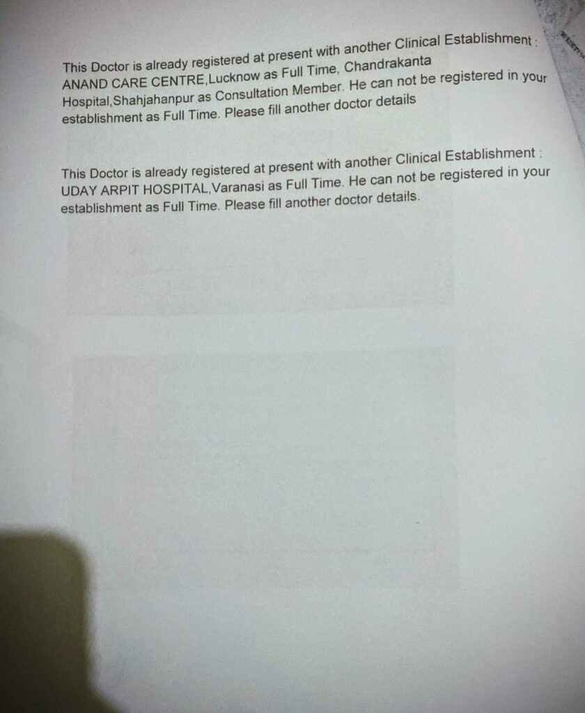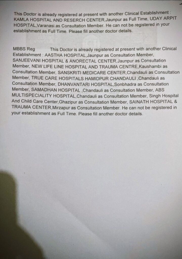 जांच में यह भी सामने आया है कि अस्पताल के दस्तावेजों में जिन डॉक्टरों के नाम दर्ज हैं,वे वास्तव में वाराणसी में उपस्थित ही नहीं रहते।सूत्रों के मुताबिक डॉ राम प्रकाश सिंह वर्तमान में लखनऊ में फुल टाइम और शाहजहांपुर में पार्ट टाइम ड्यूटी पर हैं।इसके बावजूद उनके नाम से अर्पित हॉस्पिटल वाराणसी में ड्यूटी दर्शाई गई है जबकि स्थानीय लोगों का कहना है कि वे कभी वाराणसी आए ही नहीं।दूसरा नाम डॉ श्रीकांत पटेल का है,जो पीएचसी गंगापुर में कार्यरत हैं,मगर उनके नाम से कई निजी अस्पतालों में कागजों पर उपस्थिति दिखाई जा रही है।
