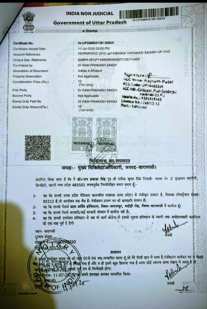 वाराणसी/-अस्पताल के दस्तावेजों में जिन डॉक्टरों के नाम दर्ज हैं वे वास्तव में वाराणसी में उपस्थित ही नहीं रहते।सूत्रों के मुताबिक डॉक्टर राम प्रकाश सिंह वर्तमान में लखनऊ में फुल टाइम और शाहजहांपुर में पार्ट टाइम ड्यूटी पर हैं।इसके बावजूद उनके नाम से अर्पित हॉस्पिटल जंसा जलालपुर में ड्यूटी दर्शाई गई है,जबकि स्थानीय लोगों का कहना है कि वे कभी वाराणसी आए ही नहीं।दूसरा नाम डॉक्टर श्रीकांत पटेल का है,जो पीएचसी गंगापुर में कार्यरत हैं मगर उनके नाम से दर्जनों निजी अस्पतालों में कागजों पर उपस्थिति दिखाई जा रही है,सवालों के घेरे में स्वास्थ्य विभाग की कार्यशैली।वाराणसी जनपद के जंसा थाना क्षेत्र के जलालपुर स्थित अर्पित हॉस्पिटल एवं जच्चा-बच्चा केंद्र में बिना योग्य चिकित्सकों के ऑपरेशन किए जाने का सनसनीखेज मामला सामने आया है।बीते दिनों सामुदायिक स्वास्थ्य केंद्र (सीएचसी) आराजी लाइन की जांच में यह खुलासा हुआ कि यहां पैरा मेडिकल स्टाफ खुलेआम ऑपरेशन कर रहे हैं।