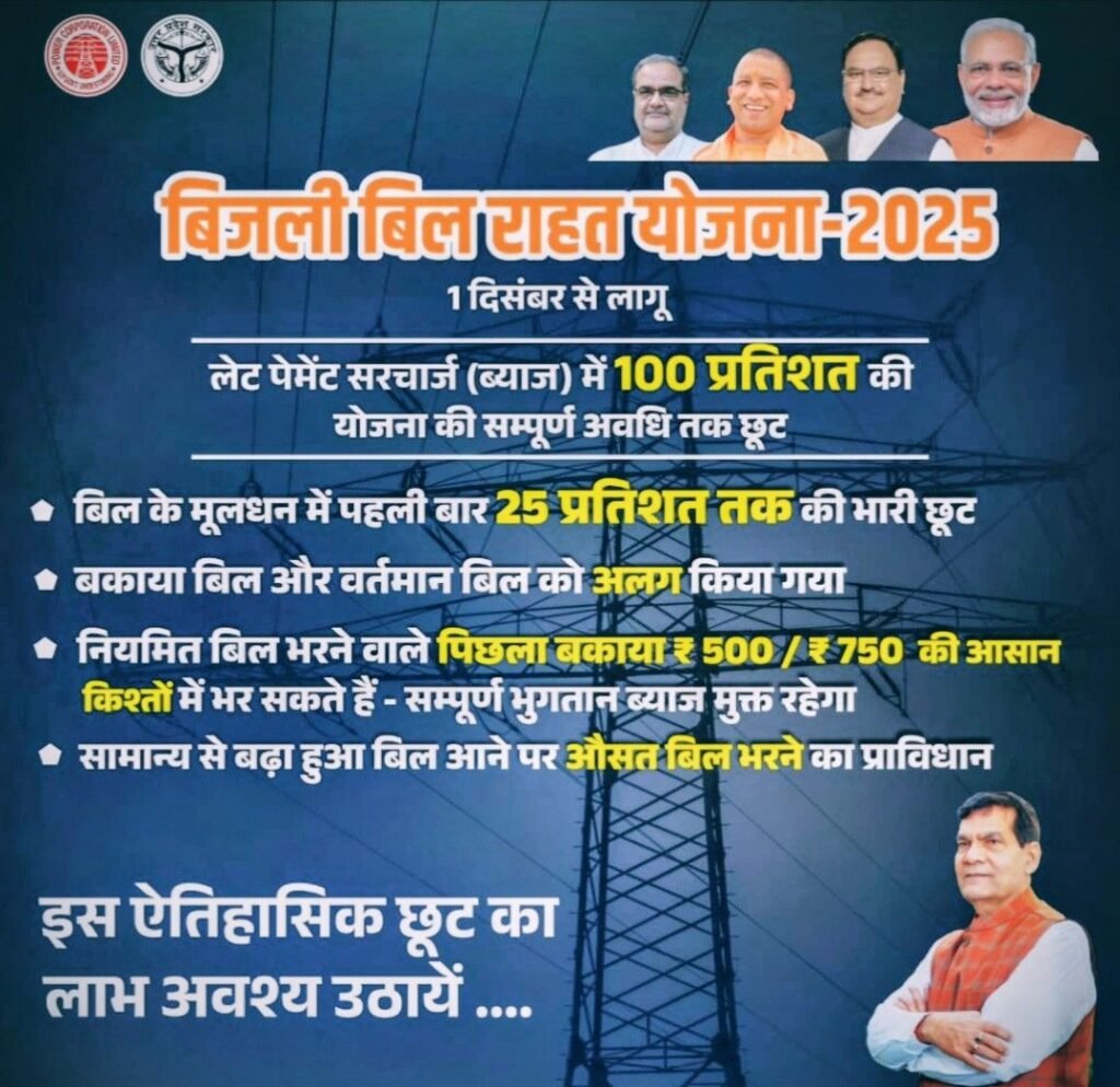 वाराणसी/-सम्मानित विद्युत उपभोक्ताओं को सूचित किया जाता है कि उत्तर प्रदेश पावर कारपोरेशन लिमिटेड द्वारा दिनांक 1 दिसम्बर 2025 से विद्युत बिल बकायेदारों के लिए बिजली बिल राहत योजना 2025-26 प्रारम्भ की जा रही है जो तीन चरणों (प्रथम चरण दिनांक 1 दिसम्बर 2025 से 31 दिसम्बर 2025 तक,द्वितीय चरण-दिनांक 1 जनवरी 2026 से 31 जनवरी 2026 तक एवं तृतीय चरण-दिनांक 1 फरवरी 2026 से 28 फरवरी 2026 तक) में होगी जिसमें एक किलो वाट एवं दो किलो वाट के समस्त घरेलू एवं एक किलो वाट के वाणिज्यिक श्रेणी के उपभोक्ताओं जिनका अंतिम भुगतान 31 मार्च 2025 के पूर्व हुआ है या जिनका भुगतान कभी नहीं हुआ है के विलम्बतम भुगतान अधिभार में शत-प्रतिशत छूट के साथ मूलधन में भी 25 प्रतिशत तक की छूट का प्रावधान है।विद्युत चोरी के प्रकरणों में राजस्व निर्धारण में भी 50 प्रतिशत तक छूट का प्रावधान है।इस योजना से खण्ड के अन्तर्गत 29 हजार नेवरपेड उपभोक्ता जिन्होंने संयोजन पश्चात कभी भुगतान नहीं किया है तथा 43 हजार लान्ग अनपेड उपभोक्ता जिन्होंने 31 मार्च 2025 के बाद से एक बार भी भुगतान नहीं किया है,इस योजना से लाभान्वित होंगे।विद्युत चोरी के 1210 प्रकरणों में भी उपभोक्ताओं को प्रथम चरण में 50 प्रतिशत तक का लाभ प्राप्त कर सकेगें।जिन उपभोक्ताओं को पूर्व में विद्युत बिल बकाये व चोरी के प्रकरणों में आरसी प्रेषित किया गया है अथवा जो प्रकरण न्यायालय में लंबित है वैसे उपभोक्ताओं के लिए भी यह योजना लागू है। समस्त उपभोक्ता अपने निकटतम विद्युत उपकेन्द्र कैश काउन्टर,जनसेवा केन्द्र,विद्युत सखी एवं मीटर रीडर के माध्यम से पंजीकरण करवाकर अपने विद्युत बिल का भुगतान कर सकते हैं।साथ ही यदि उपभोक्ता चाहें तो आनलाइन वेबसाइट www.uppcl.org पर भी अपने विद्युत बिल का भुगतान कर सकते हैं।विद्युत विभाग द्वारा बिजली बिल राहत योजना 2025-26 को सफल बनाने एवं अधिक से अधिक उपभोक्ताओं को लाभ पहुँचाने हेतु व्यापक प्रचार प्रसार किया जा रहा है। खण्ड द्वारा जगह-जगह बैनर व पोस्टर लगाये गये है एवं प्रचार गाड़ी से प्रचार किया जा रहा है।योजना के दौरान प्रत्येक दिन उपकेन्द्र के काउन्टर के अतिरिक्त प्रत्येक उपकेन्द्र से लगायत 02-02 गांवों में कुल 44 कैम्प आयोजित किये जायेंगे।योजना के दौरान कैम्प में उपभोक्ताओं के बिलिंग सम्बन्धित समस्याओं एवं अन्य समस्याओं का भी निस्तारण किया जायेगा।खण्ड का उद्देश्य है कि सुदूर ग्रामीण क्षेत्रों में एक-एक ग्रामीण उपभोक्ताओं से सम्पर्क करके उनको योजना का लाभ पहुँचाना है।साथ ही उपभोक्ताओं में बिजली बिल राहत योजना 2025-26 को लेकर काफी उत्साह देखा गया है।सभी सम्मानित उपभोक्ताओं से निवेदन है कि भीड़ से बचने एवं योजना का अधिक से अधिक लाभ पाने के लिए जल्दी आयें एवं ज्यादा लाभ पायें एवं अप